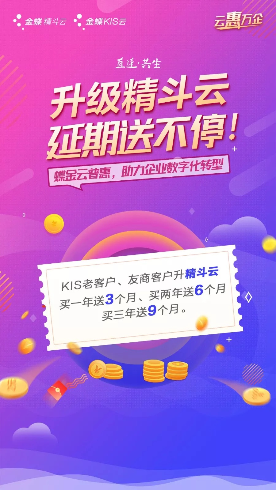 KIS老客戶、友商客戶升級(jí)至精斗云,享有買一年送3個(gè)月、買兩年送6個(gè)月、買三年送9個(gè)月的權(quán)益。