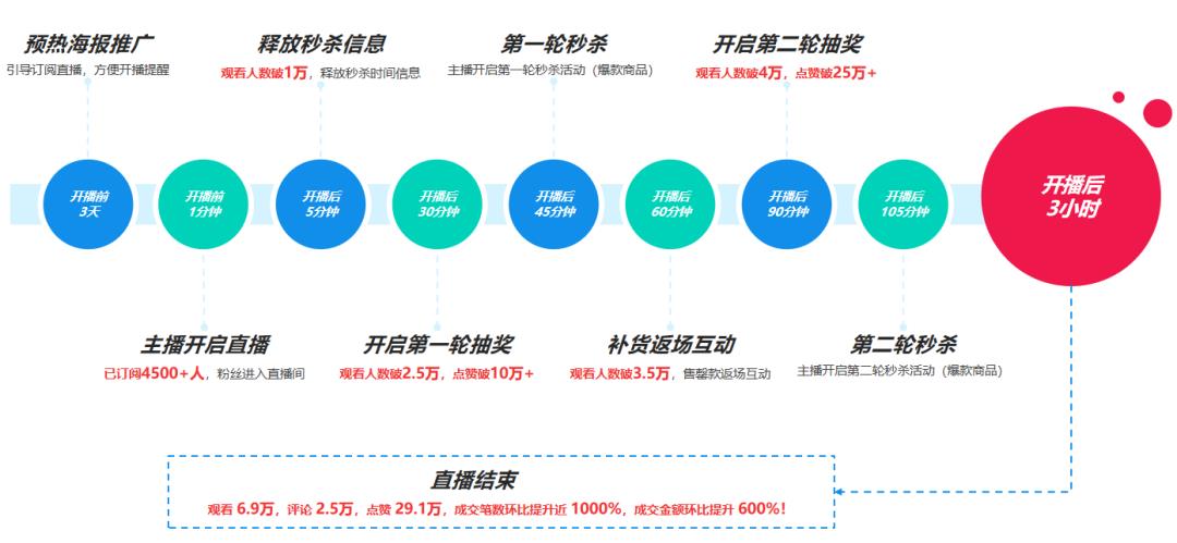 直播之前通過(guò)預(yù)熱海報(bào)推廣和積累人氣,引導(dǎo)客群訂閱直播內(nèi)容,方便開(kāi)播提醒。開(kāi)啟直播后,已訂閱的用戶(hù)超過(guò)80%進(jìn)入直播間;通過(guò)爆款商品,吸引更多的客戶(hù)進(jìn)去直播間,觀看人數(shù)迅速突破1萬(wàn)人;開(kāi)啟第一輪抽獎(jiǎng),觀看人數(shù)破2.5萬(wàn),點(diǎn)贊破10萬(wàn)+;補(bǔ)貨返場(chǎng)互動(dòng),觀看人數(shù)破3.5萬(wàn),售罄款返場(chǎng)互動(dòng);開(kāi)啟第二輪抽獎(jiǎng),觀看人數(shù)破4萬(wàn),點(diǎn)贊破25萬(wàn)+;第二輪秒殺,主播開(kāi)啟第二輪秒殺活動(dòng)(爆款商品)……